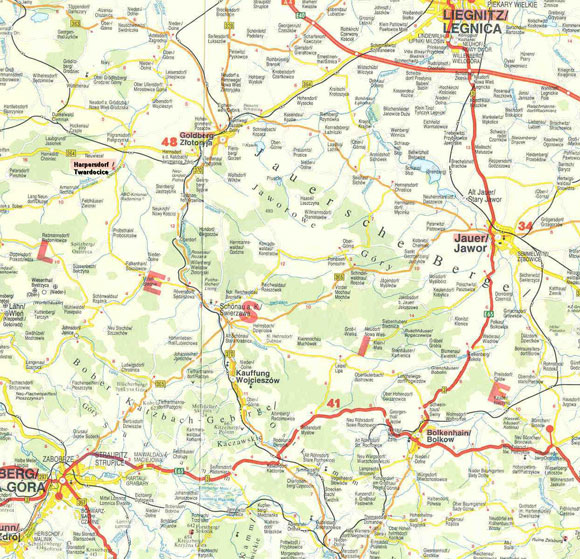 Take Route A4/E40 west. Cross over Route 3 south of Liegnitz/Legnica. Turn southwest onto Route 364 southwest of Liegnitz/Legnica. Continue as above.