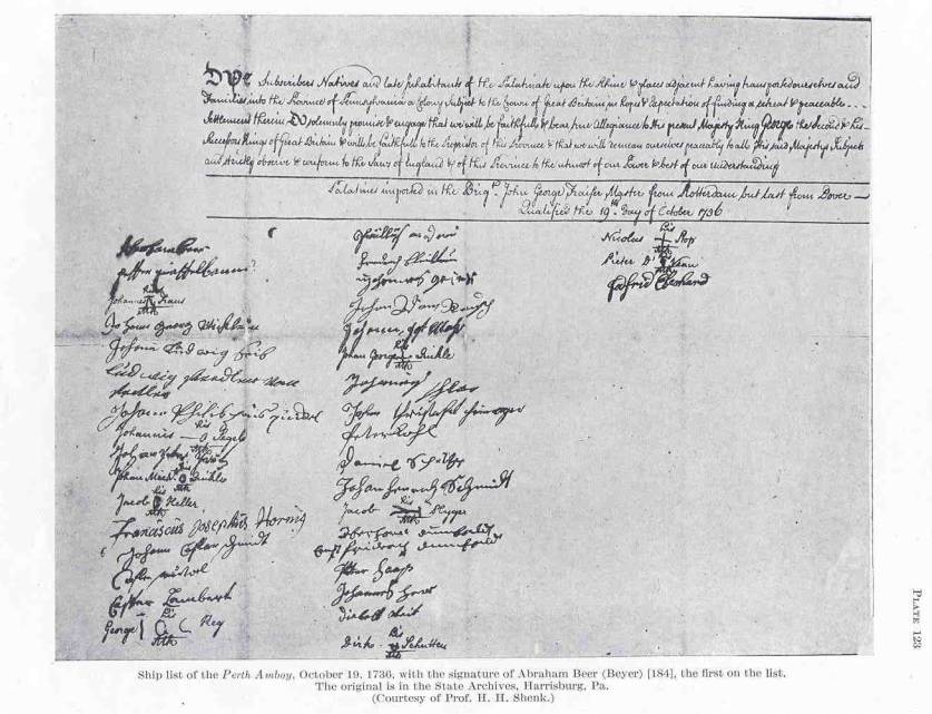 Palatines imported in the Brigantine, Perth Amboy, George Fraiser, Master, from Rotterdam, Netherlands, but last from Dover, England. Qualified October 19, 1736, in Philadelphia, PA.