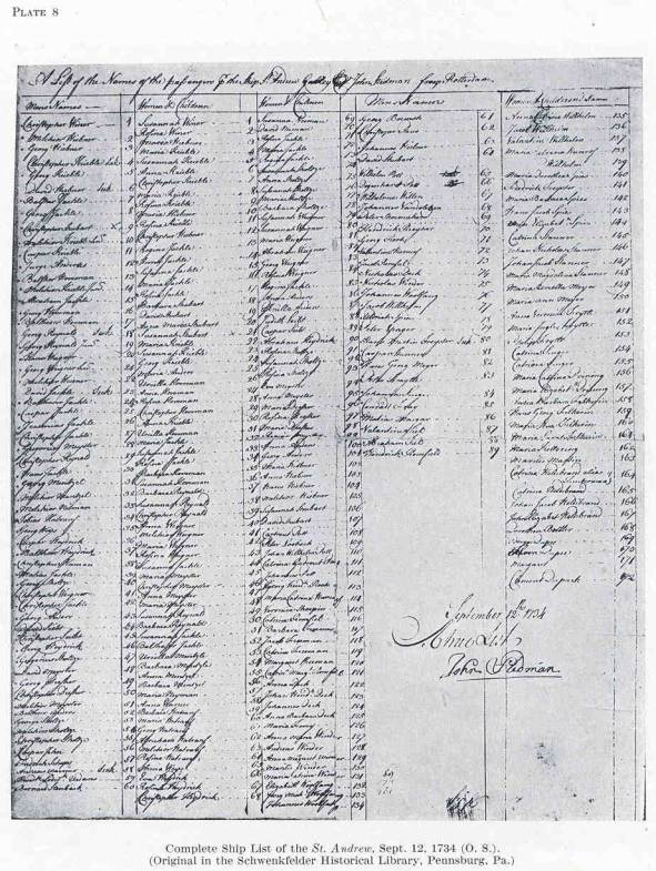 Palatines imported in the Ship, Saint Andrew, John Stedman, Master, from Rotterdam, Netherlands, but last from Plymouth, England, as per Clearance thence.  Qualified Sept. 12, 1734 [Old Style] at Philadelphia, PA.