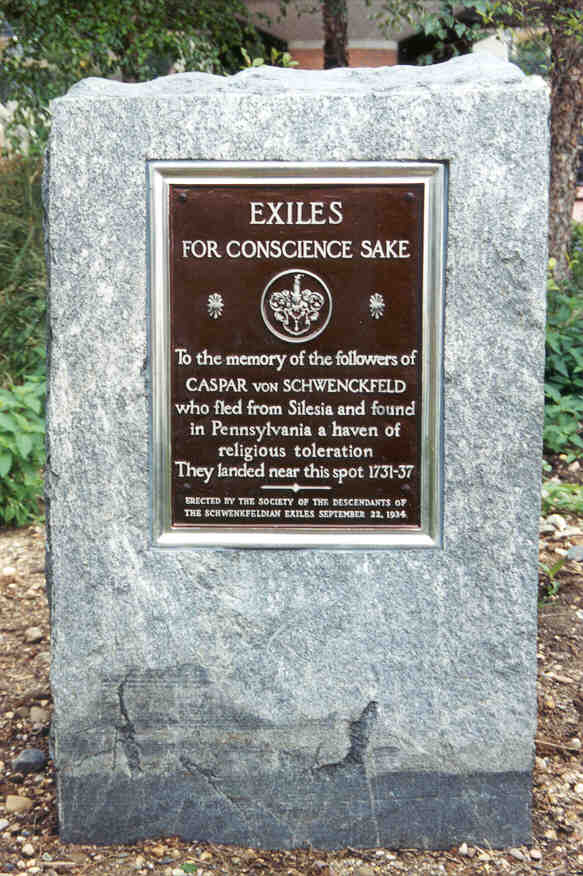 In 1934, on the 200th anniversary of the landing of the Schwenkfeldian Exiles at the foot of Walnut Street, Philadelphia, PA, a bronze tablet was placed on the Webb Building at Delaware Avenue and Walnut Street, Philadelphia, PA, and dedicated. With the development of Penn’s Landing, the plaque was moved to a pillar at the foot of Walnut Street Mall and rededicated on September 19, 1976, at the 242nd Gedächtnis-tag (Day of Remembrance). Sometime in 1977 this bronze plaque disappeared and an aluminum plaque bearing the same inscription was installed to replace it. Due to more renovations to the Penn’s Landing area, the aluminum plaque was again temporarily removed. In early January 1999, the FBI returned the original bronze Exile plaque, which had been missing for 22 years, to the Schwenkfelder Library, Pennsburg, PA. How exciting that this long-lost tribute to our ancestors re-surfaced after all that time. David Luz, Executive Director, Schwenkfelder Library, was quoted, “It’s a reminder of the sacrifices of our forefathers . . . a reminder of what they went through for coming here so we can be here today.”
